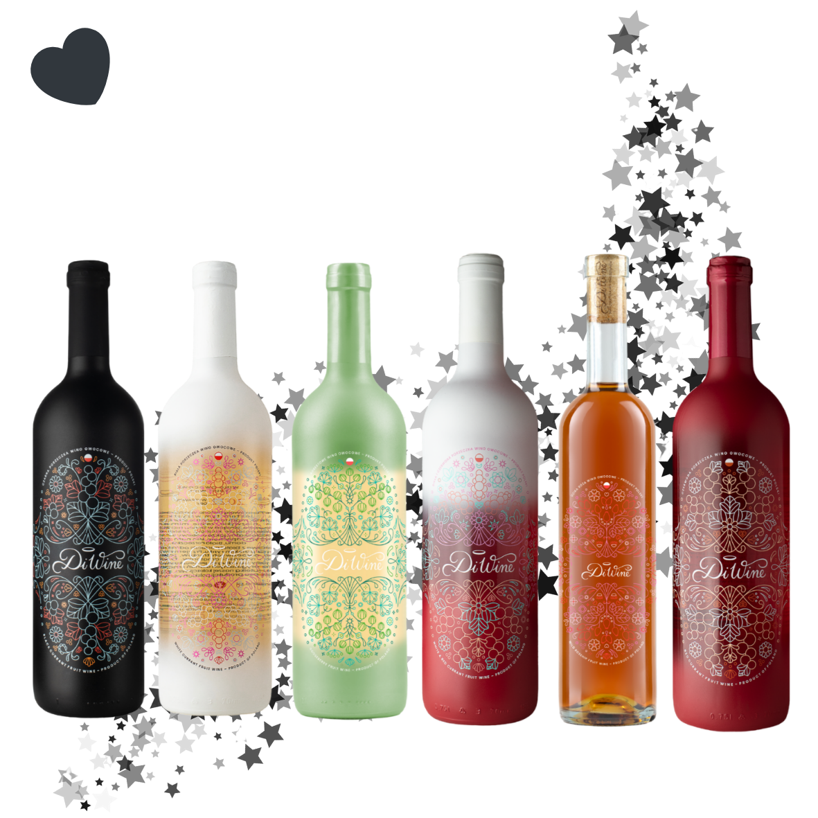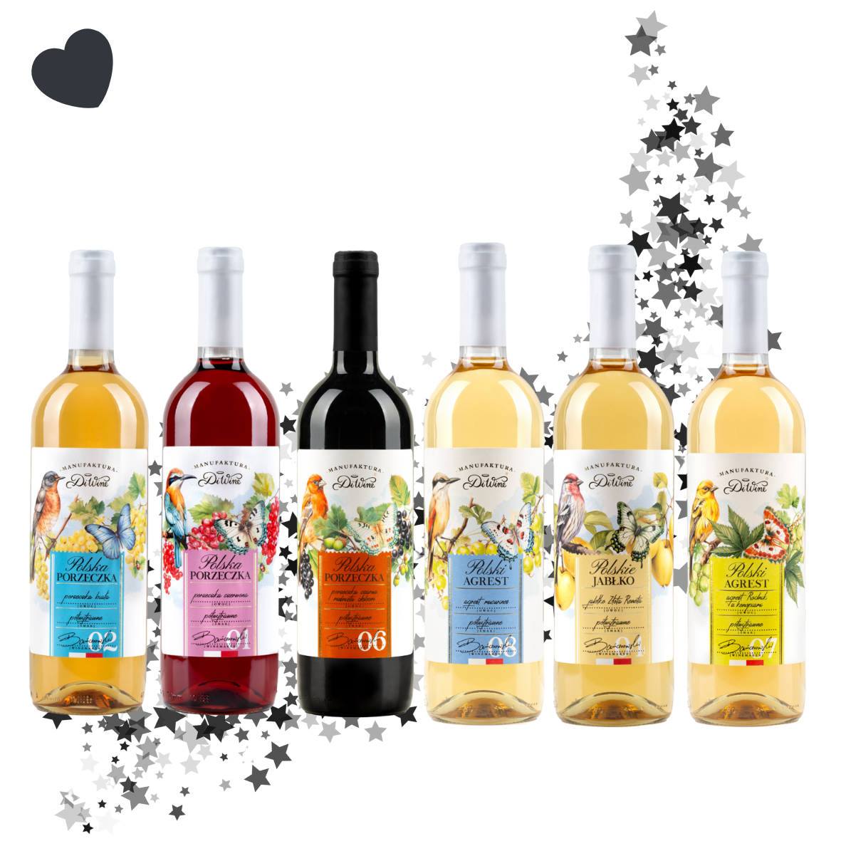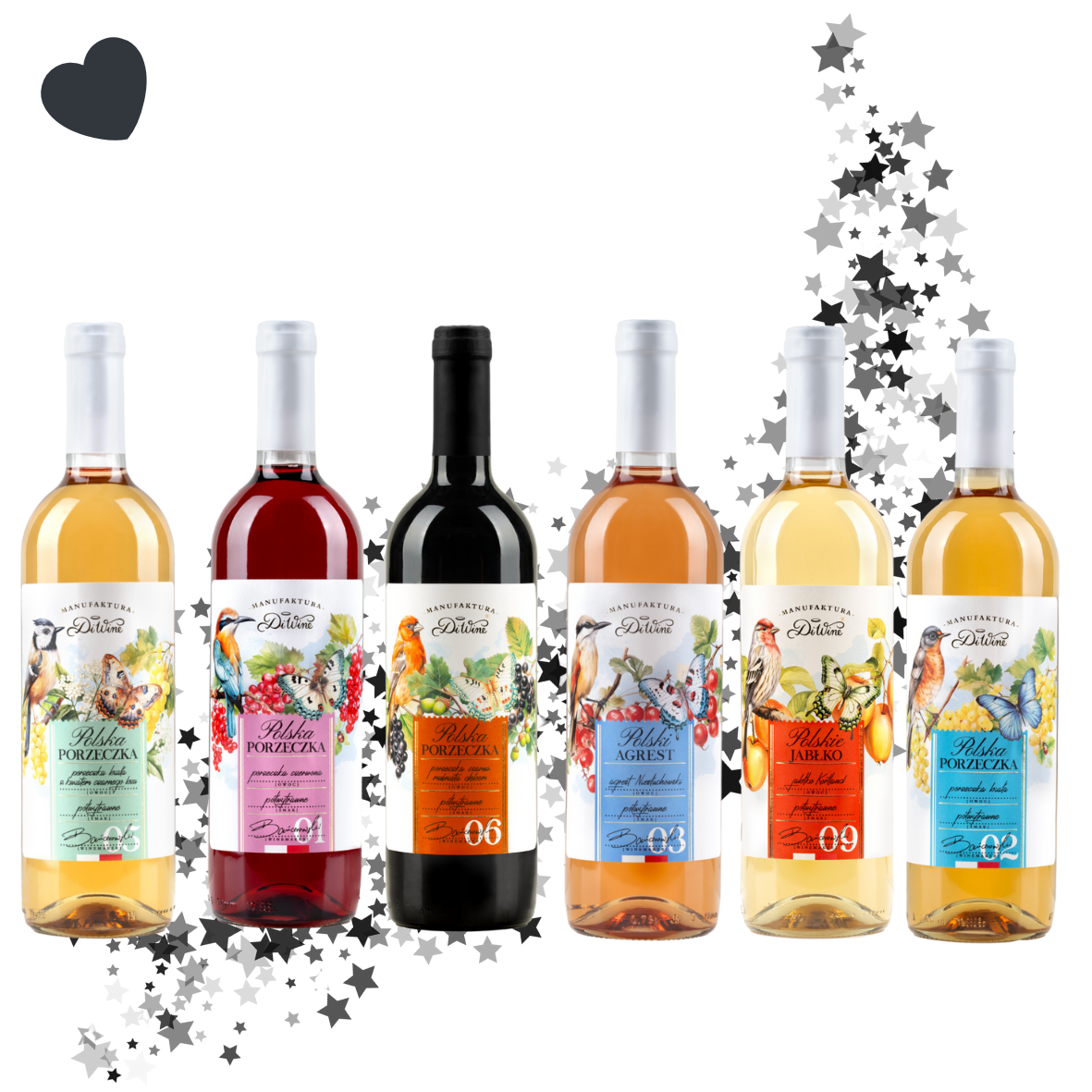 🖤 BLACK WEEK 🖤 6 butelek z winem: biała porzeczka z kwiatem czarnego bzu półwytrawne czerwona porzeczka półsłodkie czarna porzeczka muśnięta dębem półsłodkie agrest Niesłuchowski półsłodkie jabłko Kortland półwytrawne biała porzeczka półwytrawne