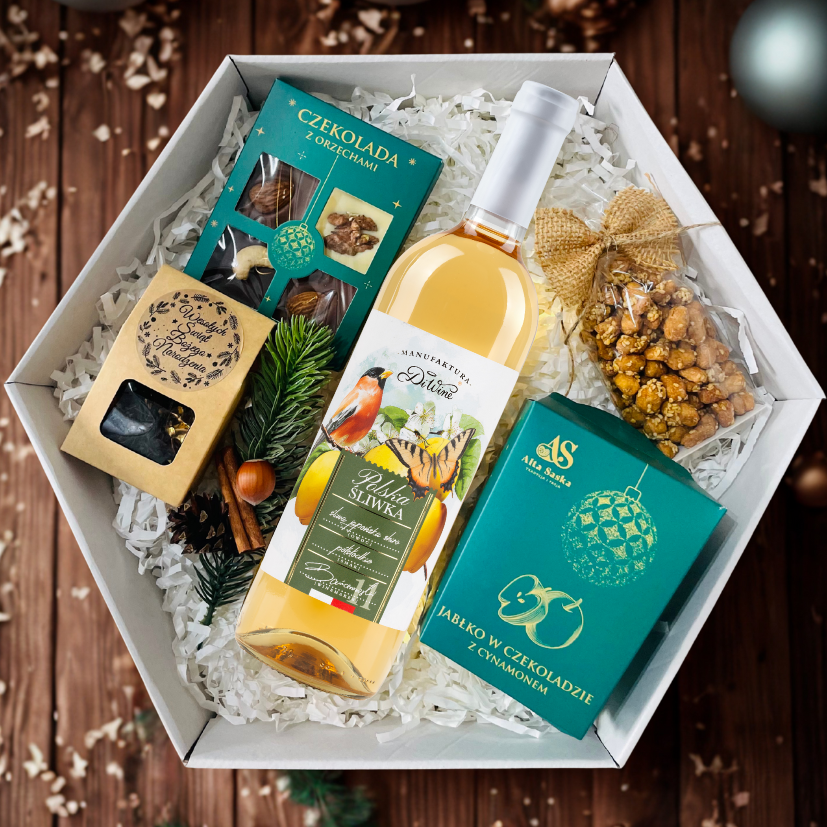 rozmiar: 330 x 380 x 90 mm (330 mierzone od ściany do ściany, 380 od kąta do kąta) pudełko karbowane wieczkowe z okienkiem i wypełniaczem herbatka czekoladki 30g (4 czekoladki) jabłko w czekoladzie z cynamonem 150g orzeszki karmelizowane gałązka dekoracyjna 1 butelka wina do wyboru:ze śliwki Shiro półwytrawne, z jagody kamczackiej półwytrawne, ze śliwomoreli […]
