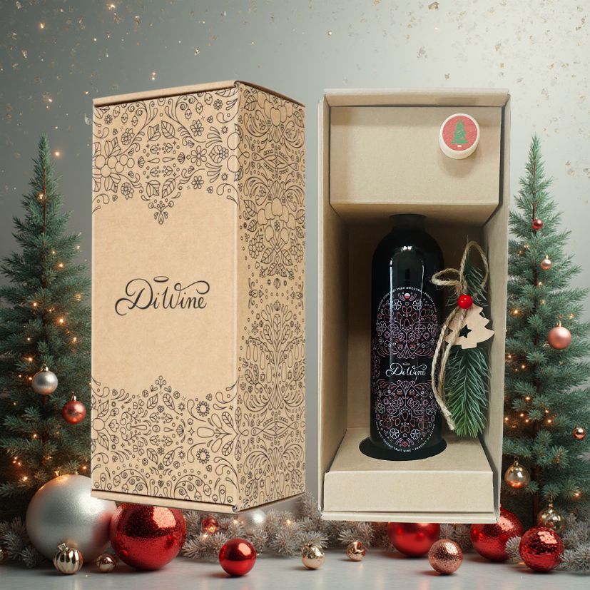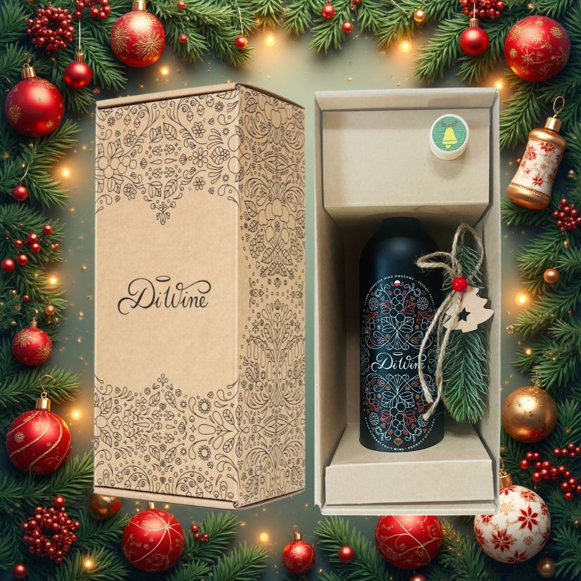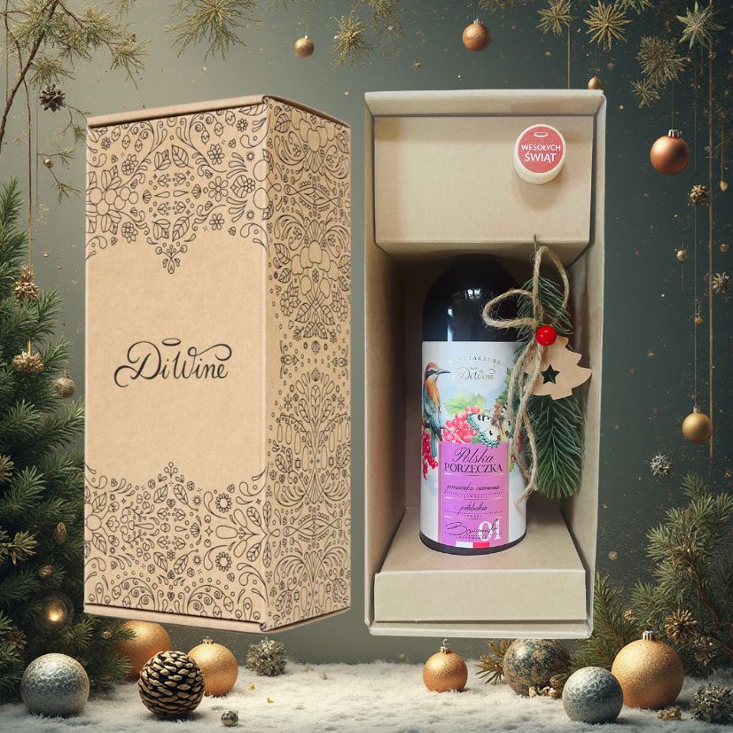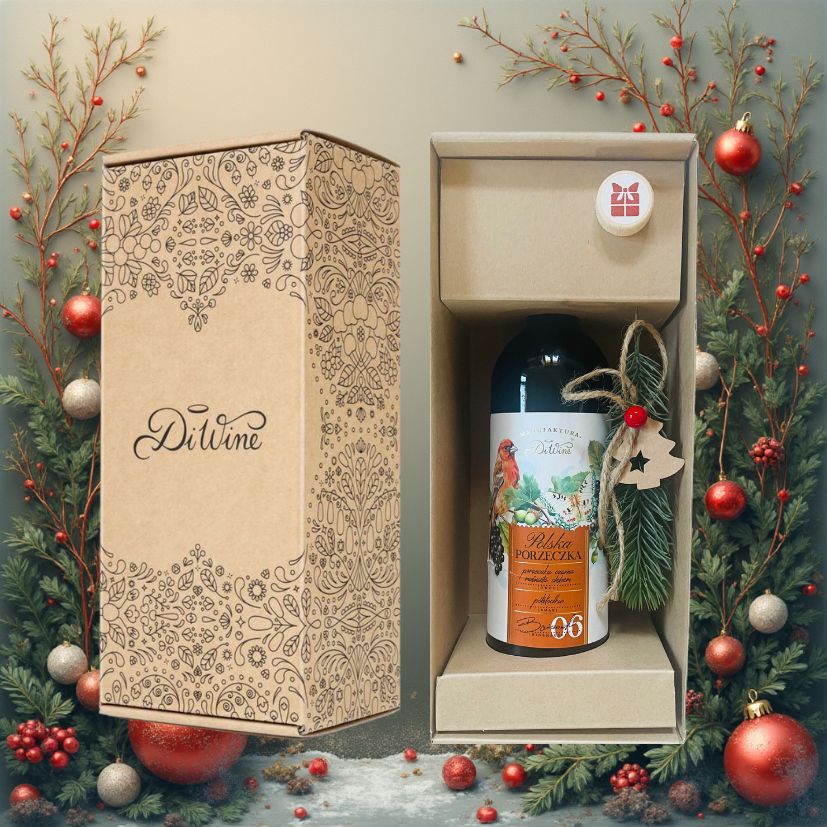wymiary opakowania: 32 cm x 14 cm x 12 cm kraftowy materiał z oryginalnym wzornictwem marki DiWine butelka wina z czarnej porzeczki muśnięte dębem, półsłodkie, 750 ml eko-korek Prezent gałązka dekoracyjna opakowanie bezpieczne do wysyłki
