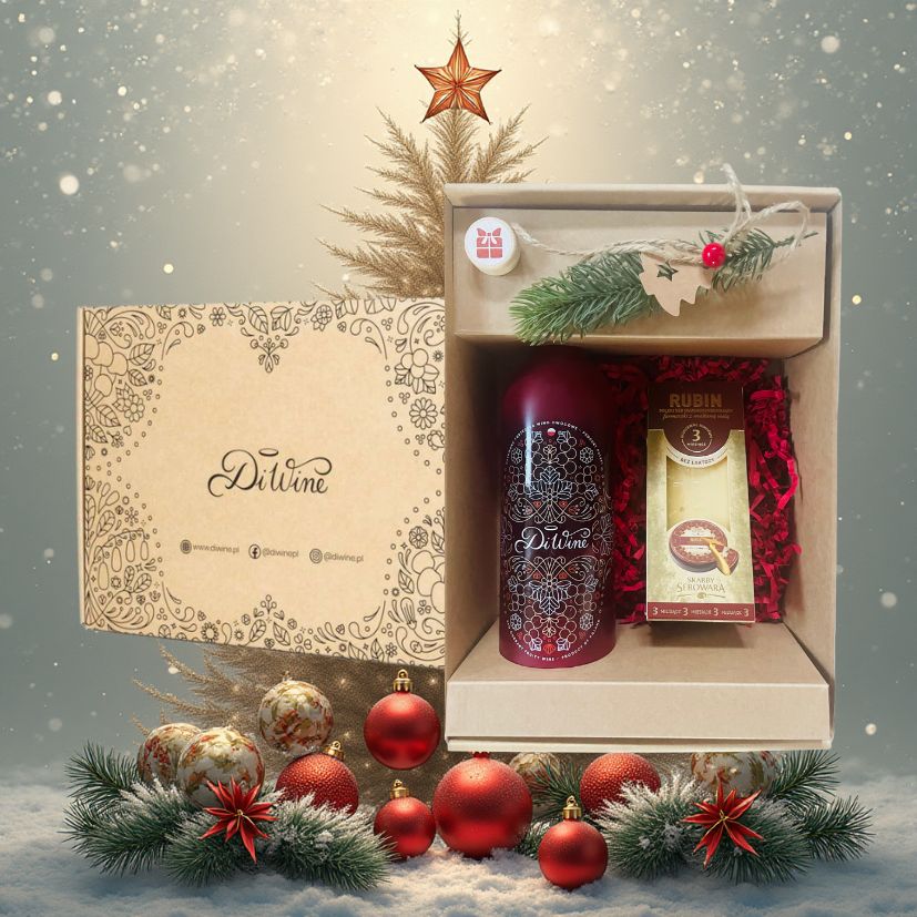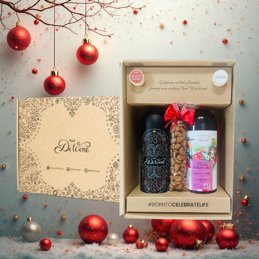 wymiary opakowania: 32 cm x 23 cm x 12 cm kraftowy materiał z oryginalnym wzornictwem marki DiWine jabłko w czekoladzie z cynamonem 100g drewniana bombka orzeszki karmelizowane zestaw zawiera: wino z białej i czerwonej porzeczki, półwytrawne 750 ml opakowanie bezpieczne do wysyłki