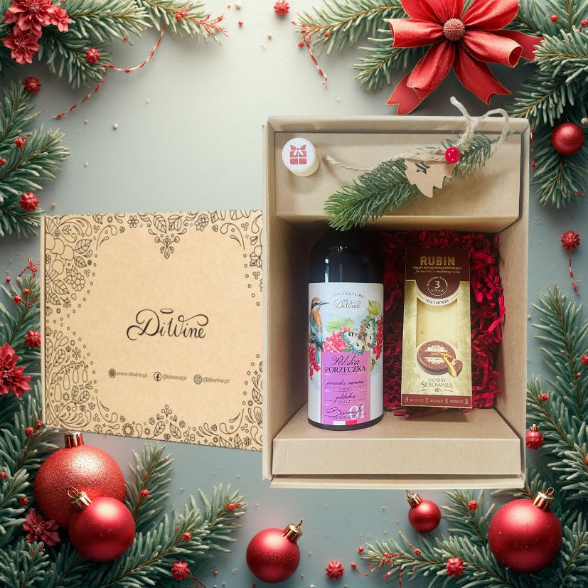 wymiary opakowania: 32 cm x 23 cm x 12 cm kraftowy materiał z oryginalnym wzornictwem marki DiWine dekoracja świąteczna czekolada 100g zestaw zawiera: wino z białej porzeczki, półwytrawne 750 ml wino z czerwonej porzeczki, półwytrawne 750 ml opakowanie bezpieczne do wysyłki
