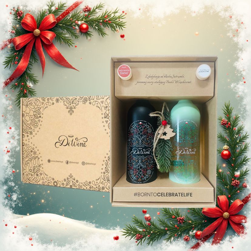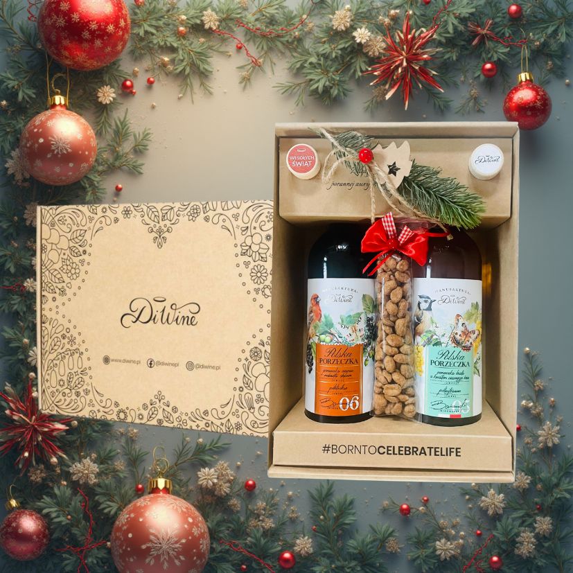 wymiary opakowania: 32 cm x 23 cm x 12 cm kraftowy materiał z oryginalnym wzornictwem marki DiWine dekoracja świąteczna 2 eko-korki: Wesołych Świąt, DiWine 2 wina do wyboru w malowanej butelce: 1 butelka: wino czerwonej porzeczki półwytrawne/ półsłodkie, wino z agrestu Mucurines półwytrawne, wino z białej porzeczki, półwytrawne, wino z dzikiej róży półwytrawne 2 […]