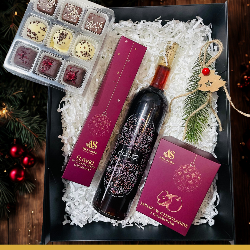 wymiary opakowania: 35 cm x 25 cm x 10 cm opakowanie premium czarne zamykane na magnes śliwka saska pudełko baton 140g jabłko w czekoladzie z cynamonem 150g praliny czekoladowe - 9 pralin 120g gałązka dekoracyjna zestaw zawiera: nagrodzone wino z suszonej dzikiej róży, słodkie 750 ml