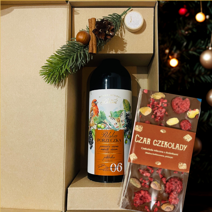 wymiary opakowania: 32 cm x 14 cm x 12 cm kraftowy materiał z oryginalnym wzornictwem marki DiWine butelka wina z czarnej porzeczki muśnięte dębem, półwytrawne, 750 ml czekolada z pistacjami i malinami 100g gałązka dekoracyjna opakowanie bezpieczne do wysyłki