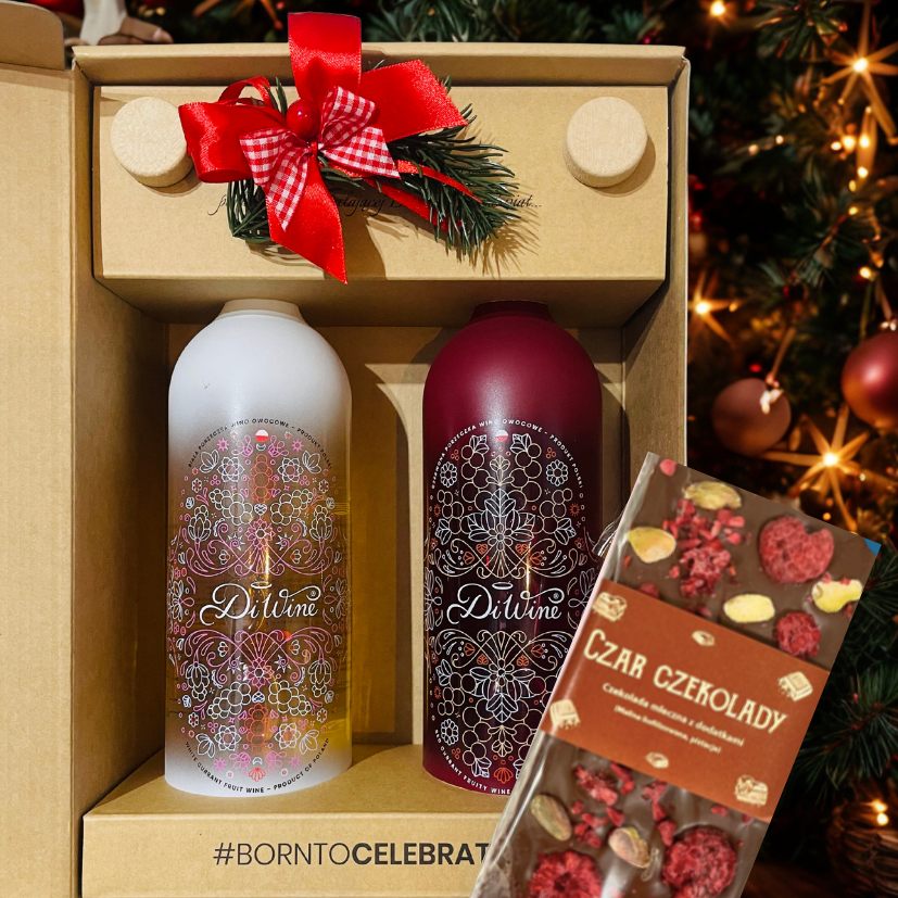 wymiary opakowania: 32 cm x 23 cm x 12 cm kraftowy materiał z oryginalnym wzornictwem marki DiWine dekoracja świąteczna czekolada 100g zestaw zawiera: wino z białej porzeczki, półwytrawne 750 ml wino z czerwonej porzeczki, półwytrawne 750 ml opakowanie bezpieczne do wysyłki