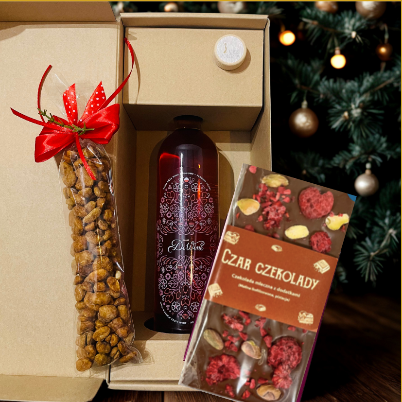 wymiary opakowania: 32 cm x 14 cm x 12 cm kraftowy materiał z oryginalnym wzornictwem marki DiWine butelka wina z dzikiej róży, półwytrawne, 750 ml czekolada z pistacjami i malinami 100g orzeszki karmelizowane opakowanie bezpieczne do wysyłki
