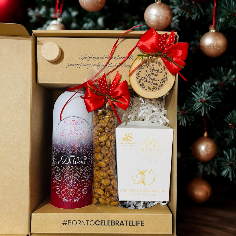 wymiary opakowania: 32 cm x 23 cm x 12 cm kraftowy materiał z oryginalnym wzornictwem marki DiWine jabłko w czekoladzie z cynamonem 100g drewniana bombka orzeszki karmelizowane zestaw zawiera: wino z białej i czerwonej porzeczki, półwytrawne 750 ml opakowanie bezpieczne do wysyłki